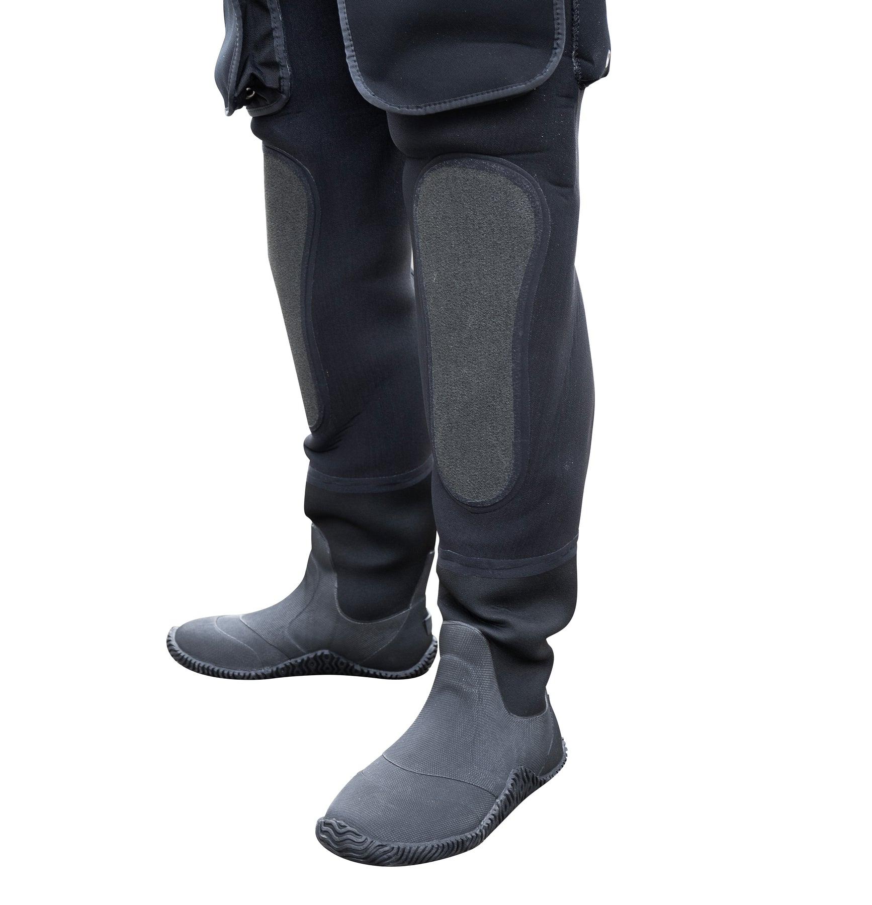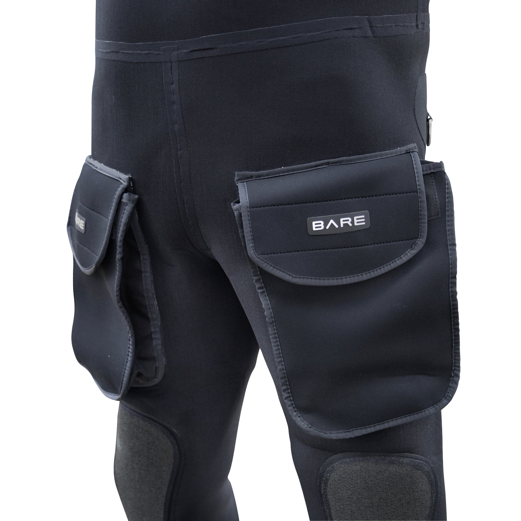 Albuene er polstret med kevlar pads og lommene er trekt frem på lårene for at det skal være lettere å hente verktøy inn og ut av dem. Hver hofte har en “light utillity D-Ring” hvor man kan henge dybdesensor eller lett verktøy. Knepads i kevlar sikrer god beskyttelse mot underlaget når man arbeider og gummierte HD-Boots** gir godt grep.