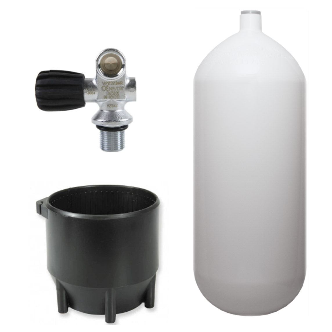 Flaske 12 liter 232 bar, kort type levert komplett med enkel kran og ståbunn. En populær flaske for dame og junior, da den er kortere enn en standard dykkeflaske.