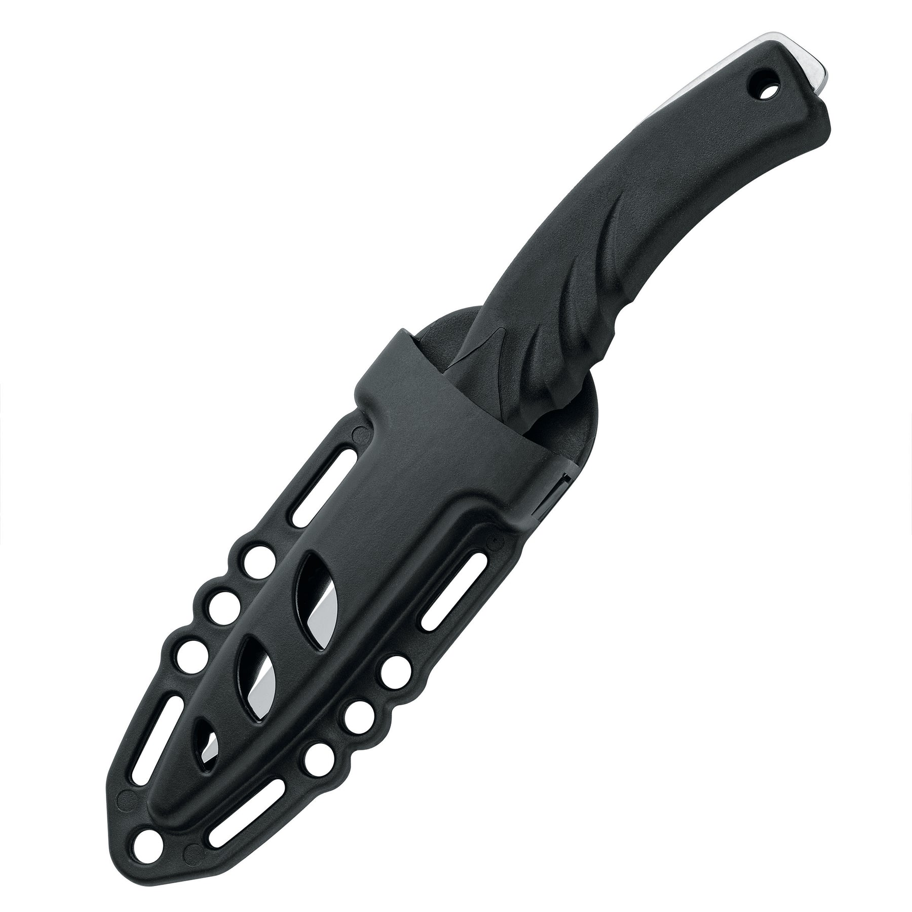 Meget hendig når du kun har en hånd tilgjengelig, som når du har harpunert en fisk og trenger kniven raskt og effektivt. Kniven er 23,5 cm lang, 25,5 med slire. Håndtaket er i gummi, og gir godt grep selv med 5- 7mm hansker og votter.