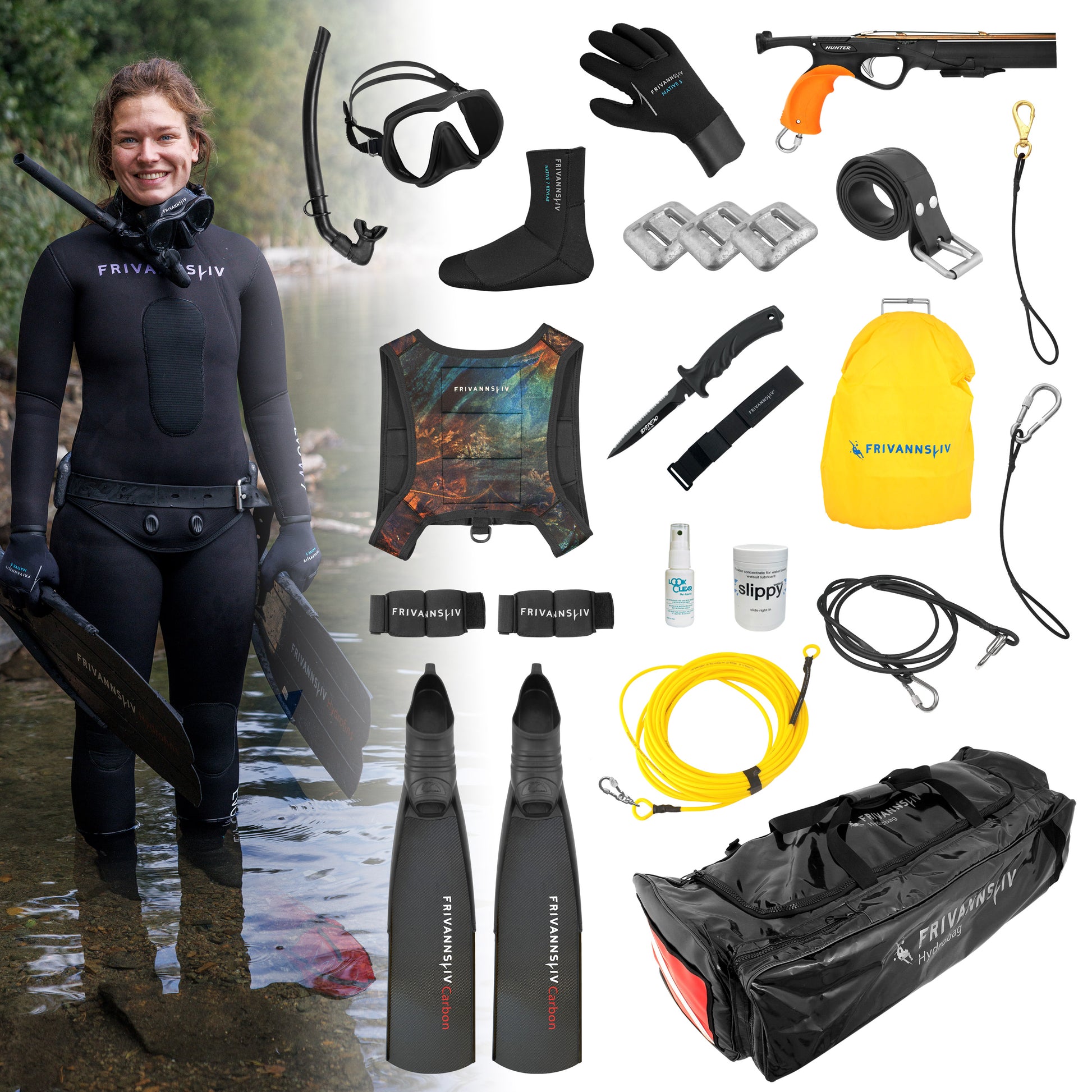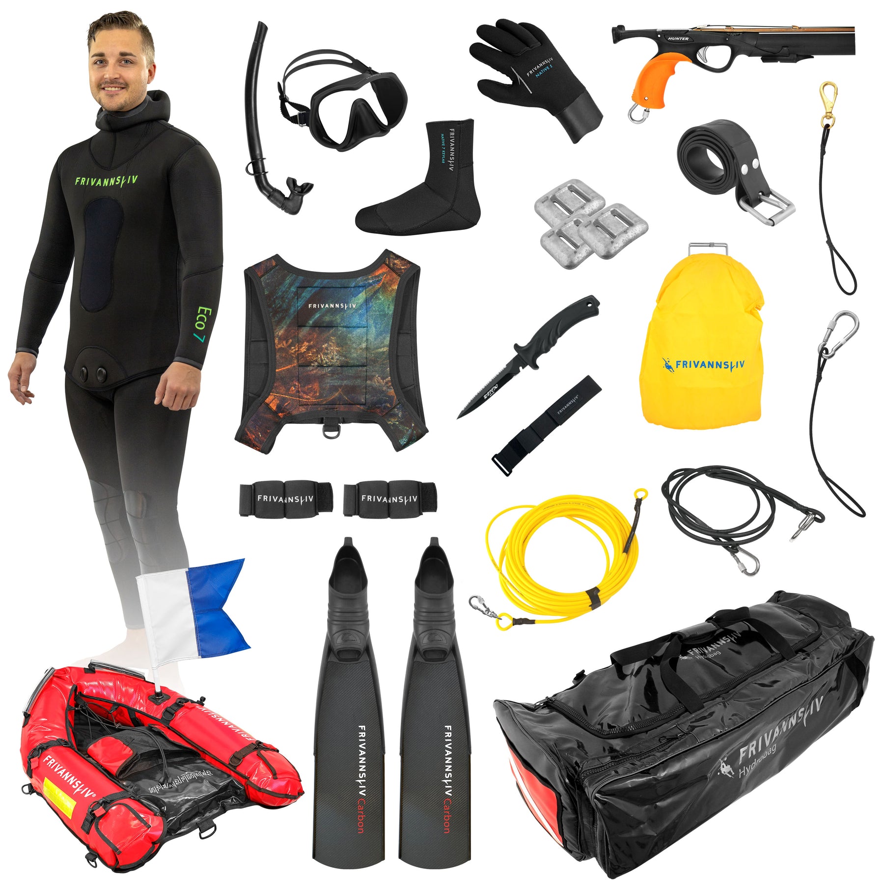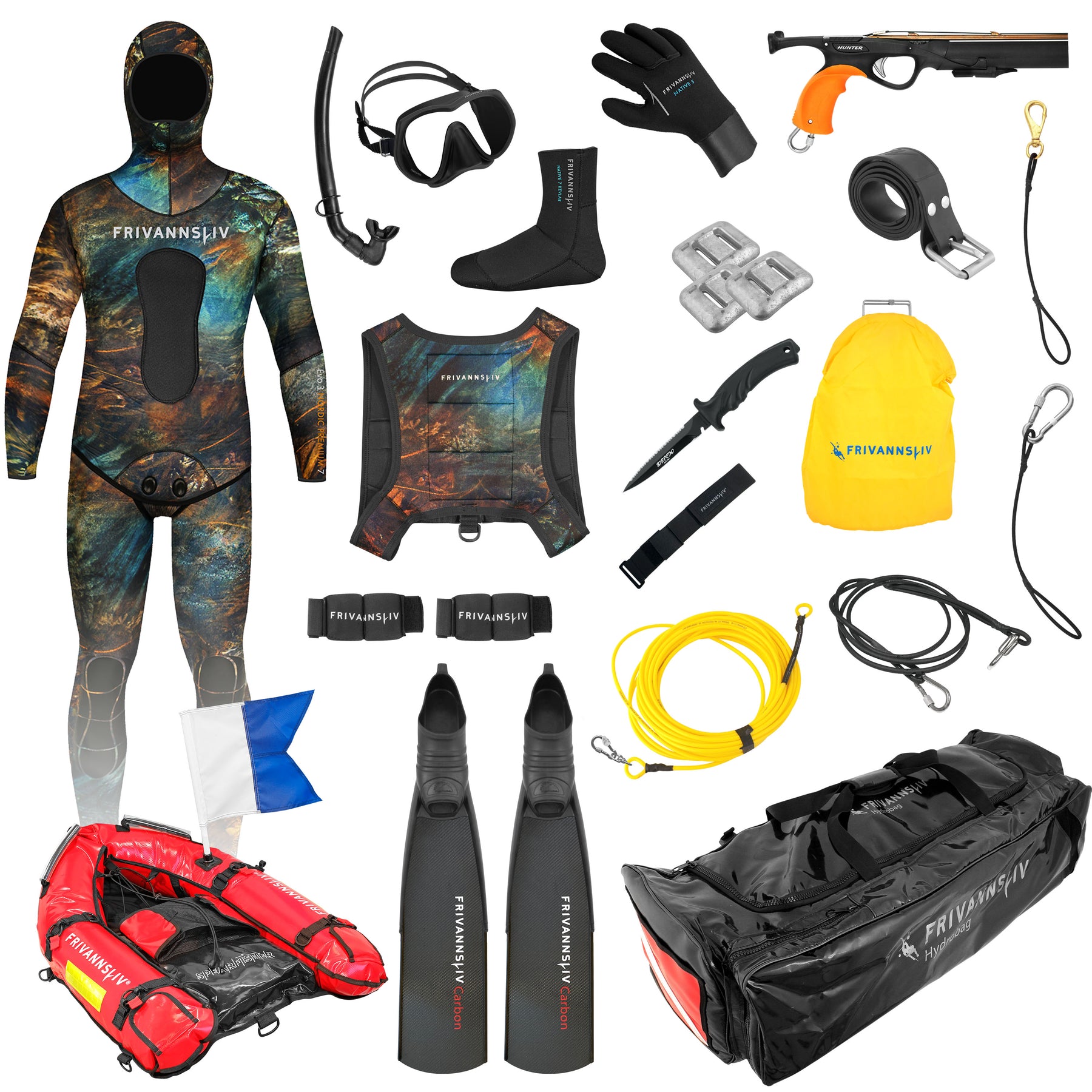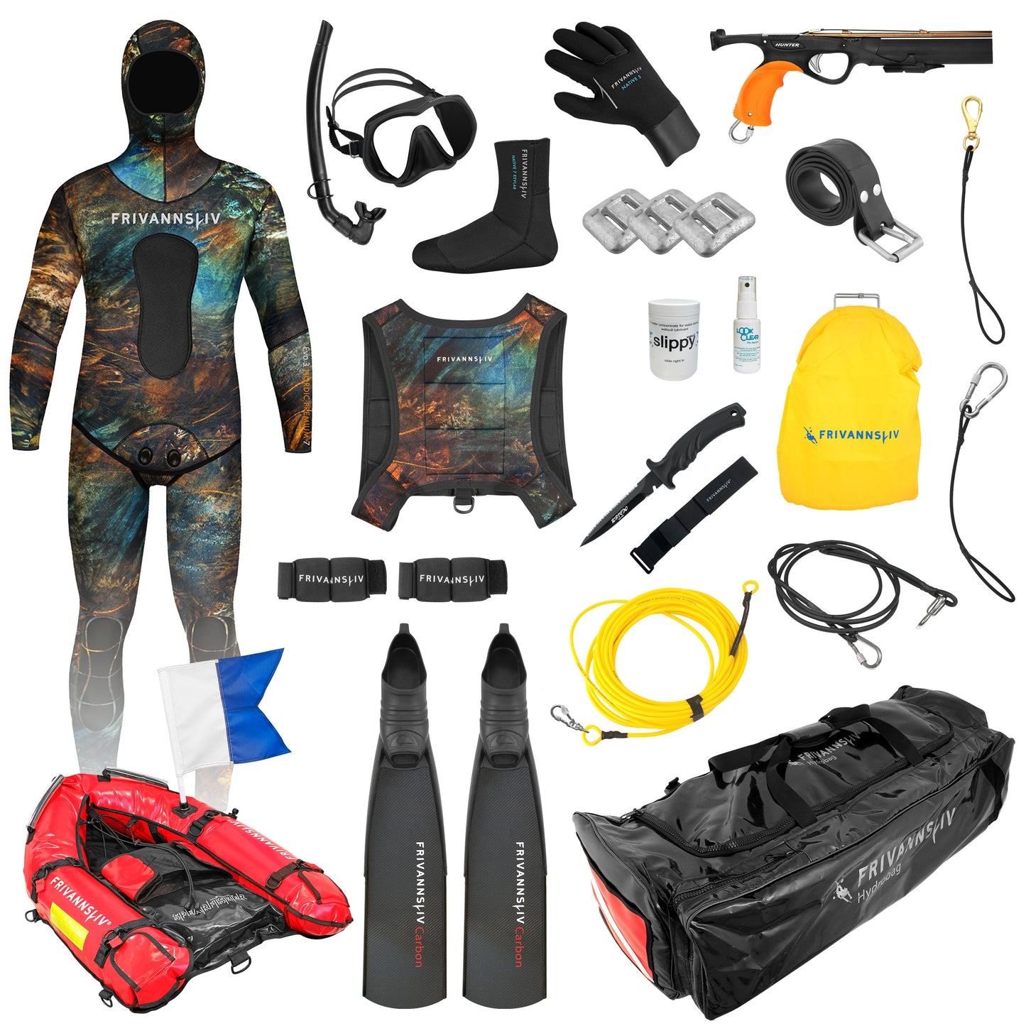 Dette er pakken for deg som vil ha topp kvalitet hele veien, og vet at det er undervannsjakt som frister. Her får du en knallgod våtdrakt, kraftig og solid harpun og fangstutstyr, karbonfinner, og ikke minst en skikkelig trygg og god fangstline.