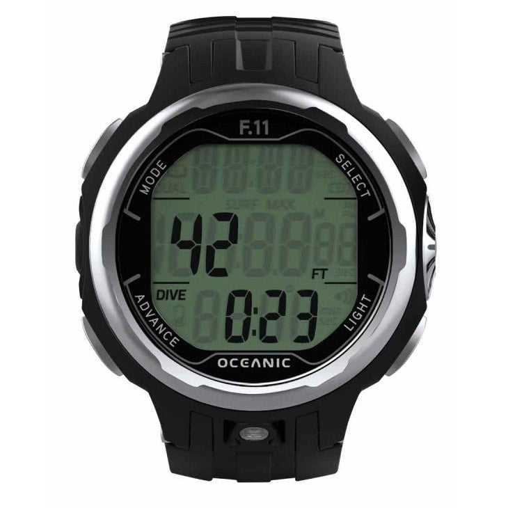 Oceanic F11 er en pålitelig og funksjonsrik fridykkercomputer som gir alt du trenger under fridykking og vannaktiviteter. Den viser dybde, dykketid og gir tilgang til både nedtellingstimer og stoppeklokke. Dykker-modus aktiveres automatisk når du passerer forhåndsinnstilt dybde, og bakgrunnsbelysning aktiveres ved dykk for ekstra lesbarhet.
