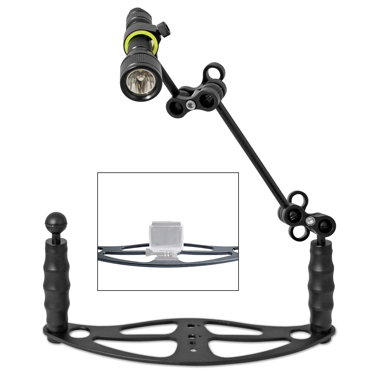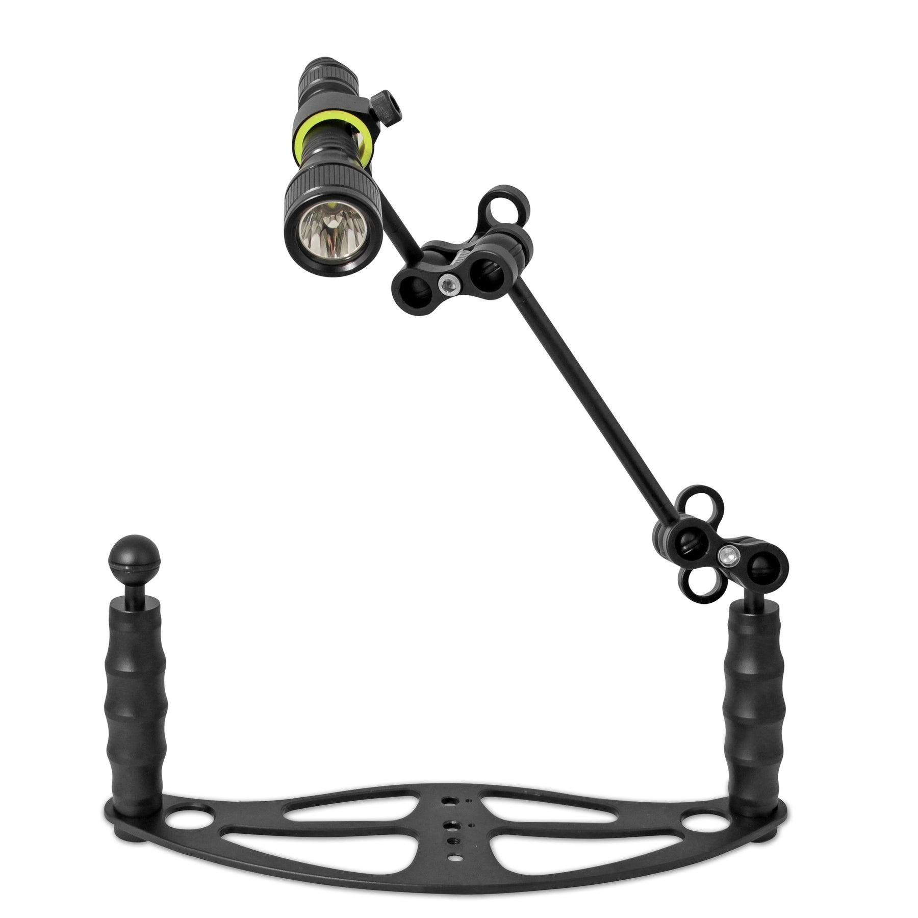 Lei av å holde ditt kamera, GoPro, Paralenz i hånden? Med OrcaTorch basetray i solid aluminium har du basen for en optimal løsning.