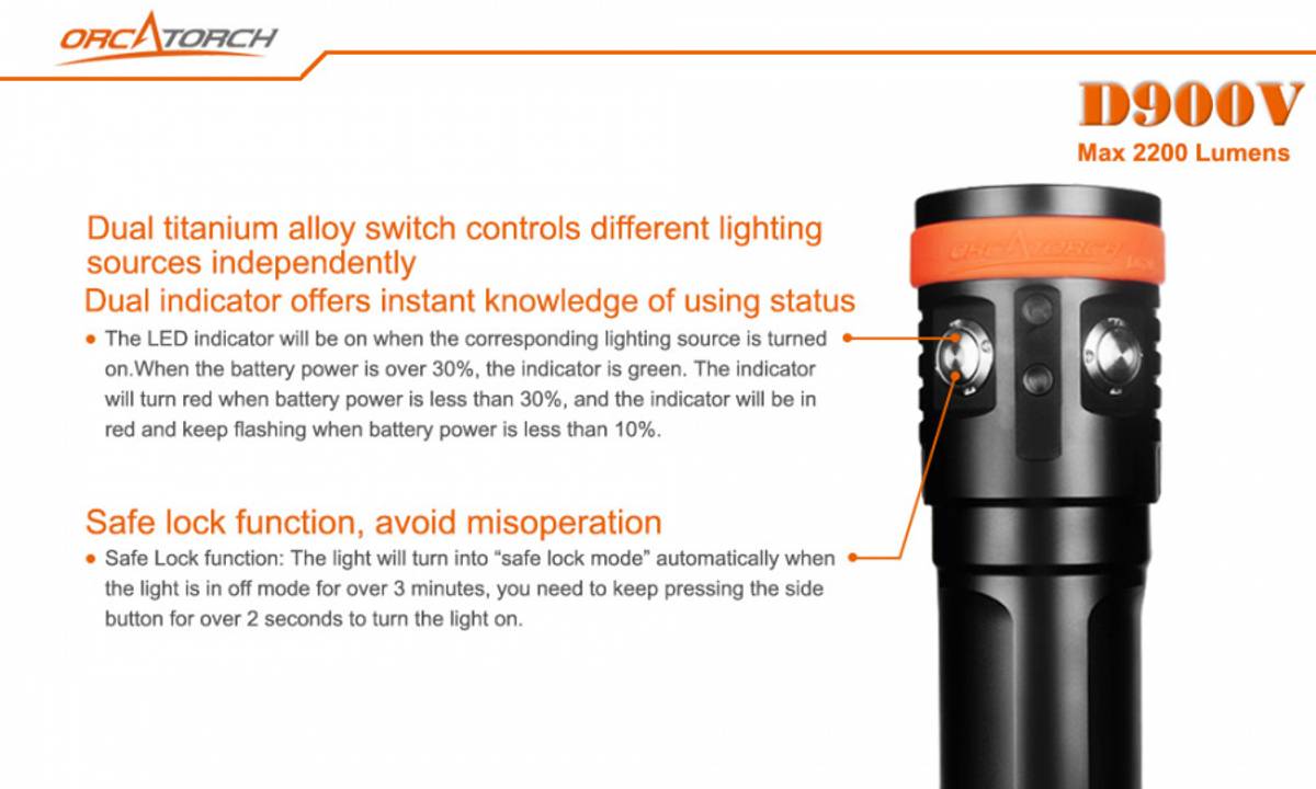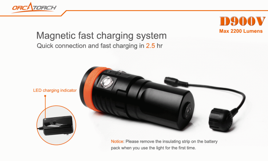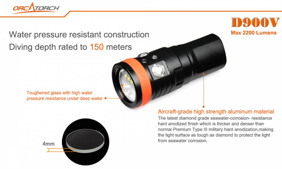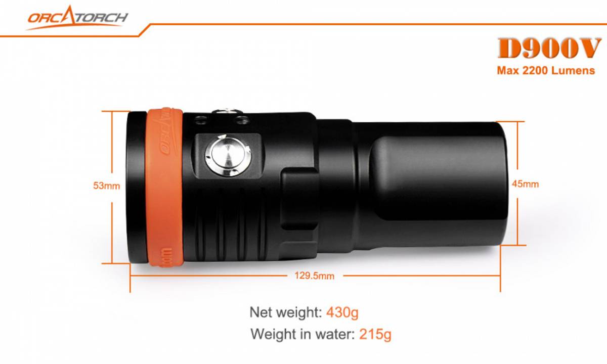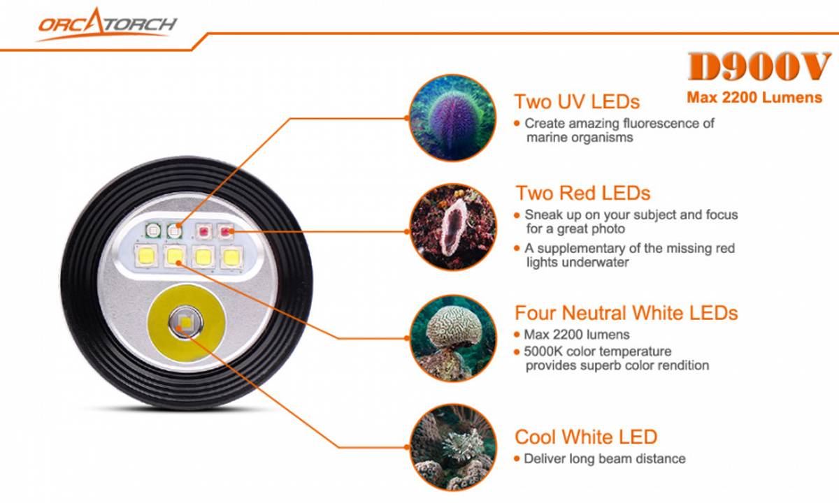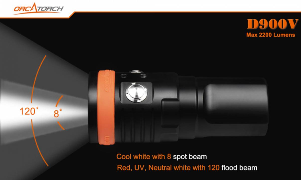 Profesjonelt 120° videolys i varmhvit, rødt og UV (blått). Lykten har også 8° spotlys (kjølig hvitt lys) og er på 2200 lumen. OrcaTorch D900V er første videolykt på markedet med rask magnetisk ladning (2,5 time) og lykten kan lades uten å ta ut batteriet.