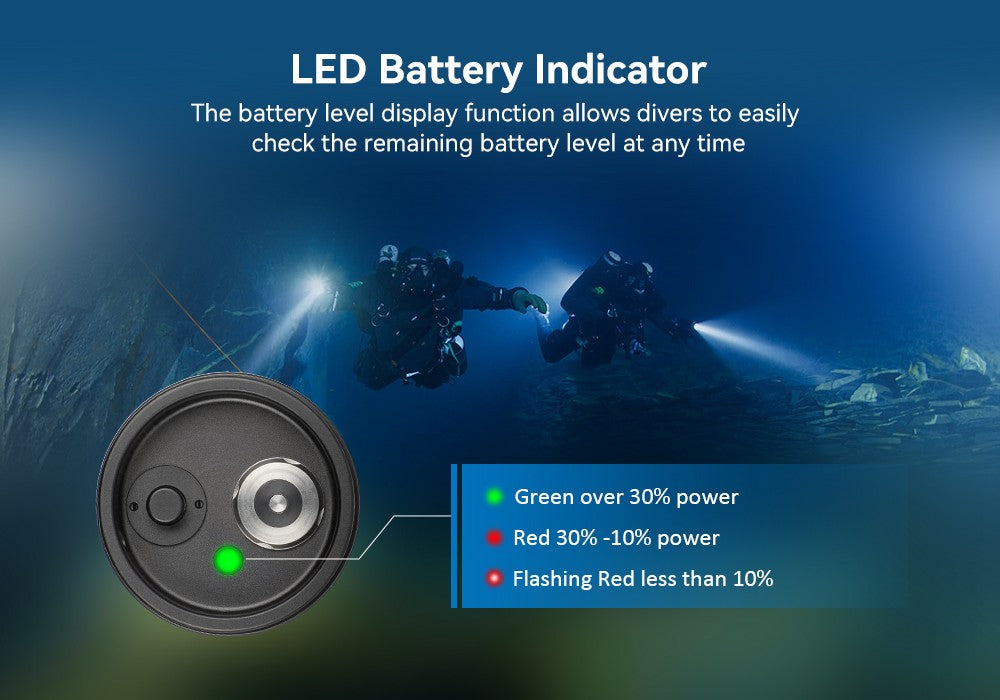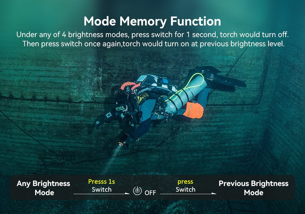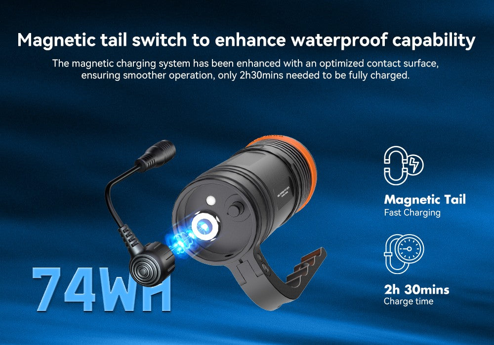 Lykten drives av en kraftig 74Wh oppladbar litium-ion-batteripakke og tilbyr fire justerbare lysstyrkenivåer med en fargetemperatur på 6500K. Den magnetiske bakbryteren er spesielt utformet for enkel betjening av modusene og har en låsefunksjon som forhindrer utilsiktet aktivering. Med sin allsidighet og pålitelighet er D920 klar for et bredt spekter av dykkeeventyr.