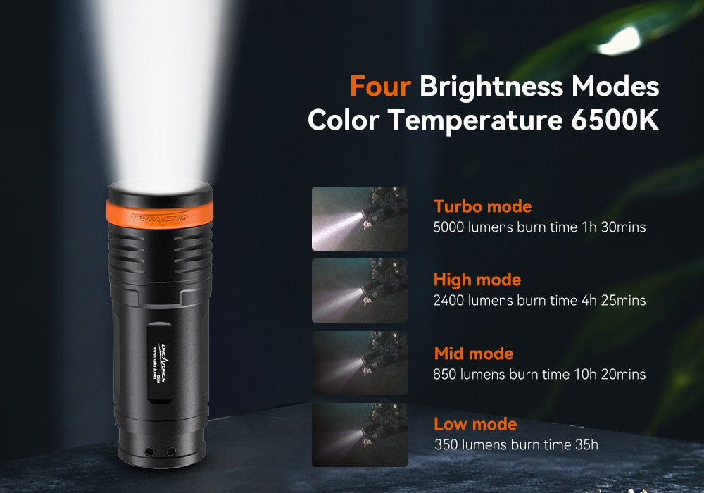Nyhet! OrcaTorch D920 TECH er en ny håndholdt primærdykkelykt som leverer imponerende 5000 lumen. Den har en tett fokusert 9° lyskjegle og har en batteritid på imponerende 45 minutter i turbo mode i 4 graders vann.
