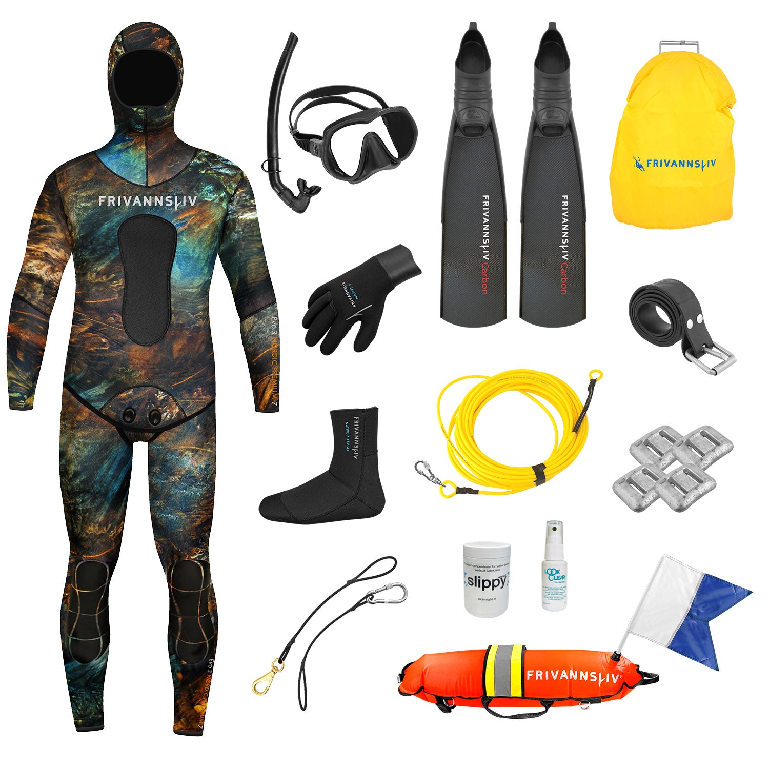 Dette er utstyrspakken vi i Frivannsliv anbefaler til deg som skal begynne med fridykking. Med en skikkelig sikkerhetsline, en svært synlig fridykkerbøye, fangstnett og oppgradert maske, hansker og belte vil du elske din nye hobby med denne utstyrspakken.