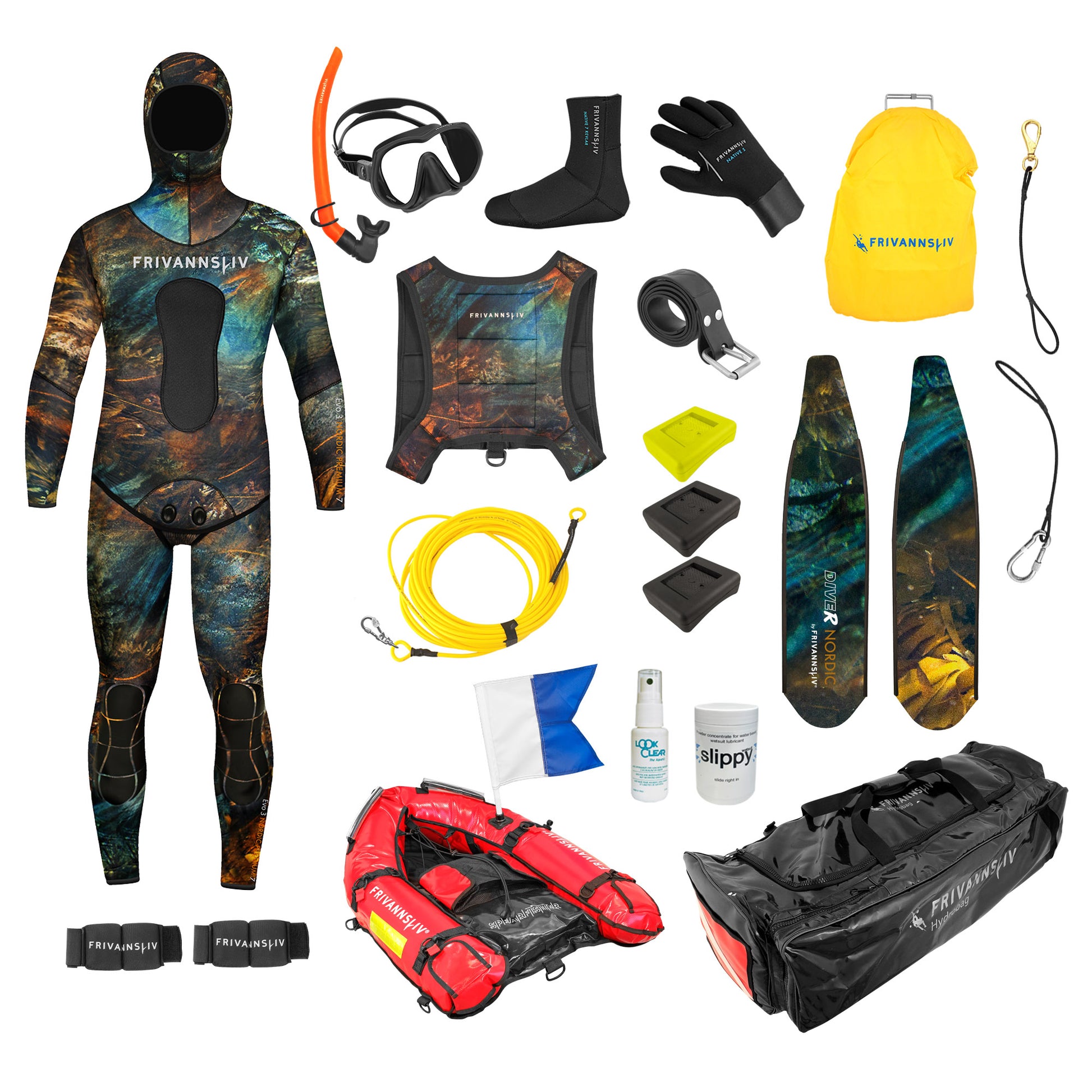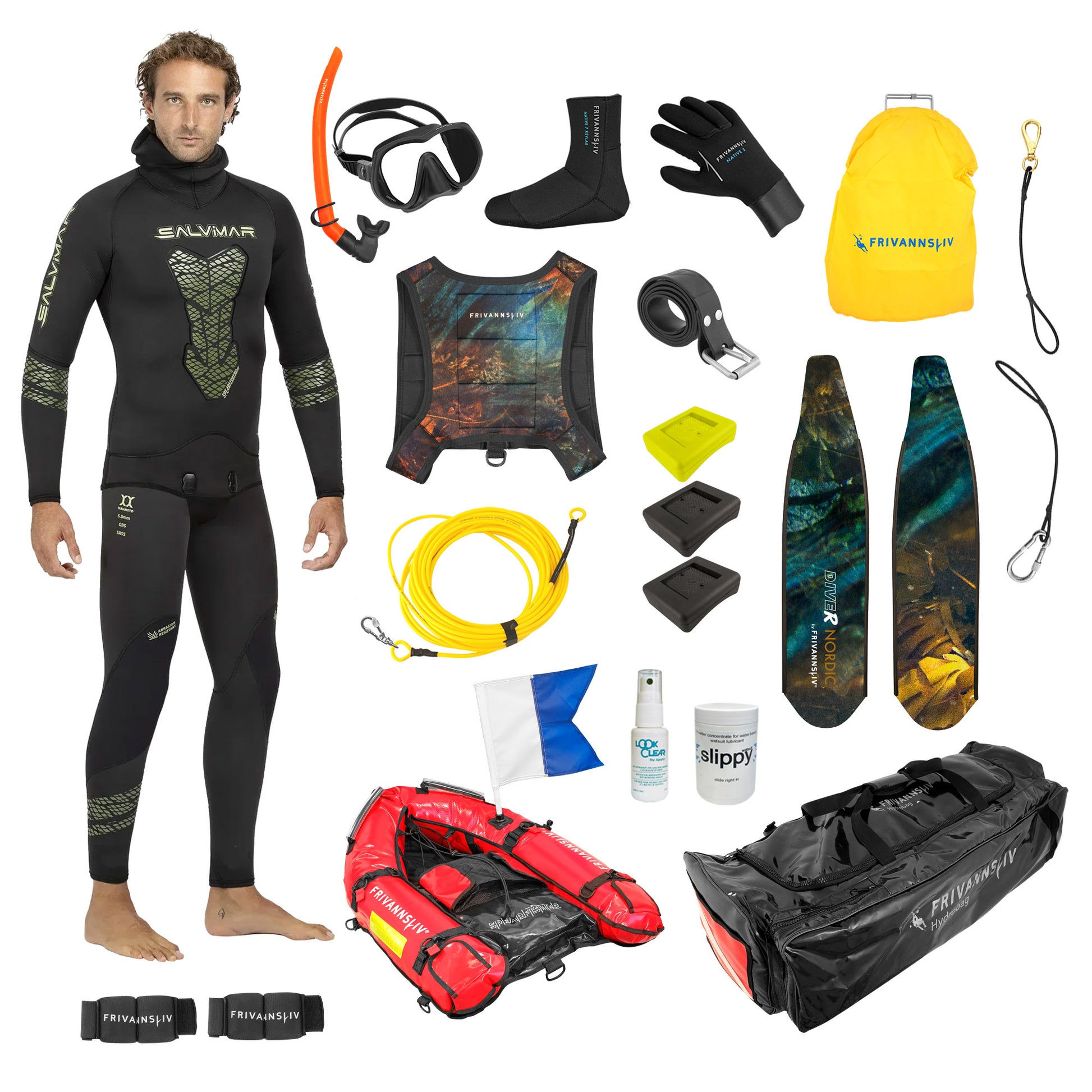 Dette er utstyrspakken med det aller grommeste utstyret. Den inneholder alt fra premium-drakten Evo 3 Nordic Premium 7mm med tilhørende blyvest, Vidsyn-masken, flåte og alle de andre produktene som hører til en fullspekket fridykkerpakke.