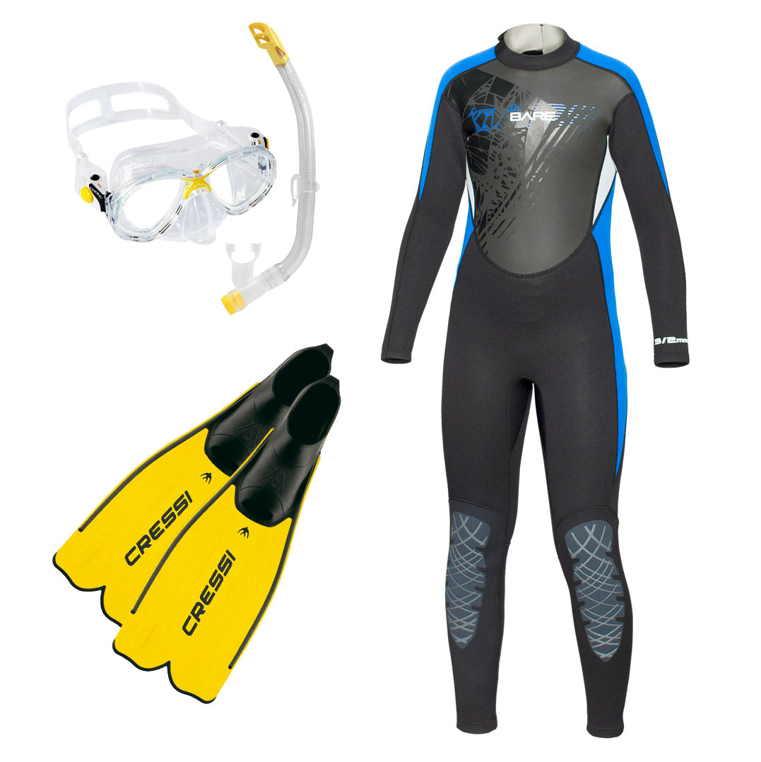 I denne utstyrspakken får du alt barnet trenger for å snorkle om sommeren eller i varmere strøk. Utstyrspakken inneholder en myk og behagelig 3/2 mm semi-dry våtdrakt, maske, snorkel og svømmeføtter.