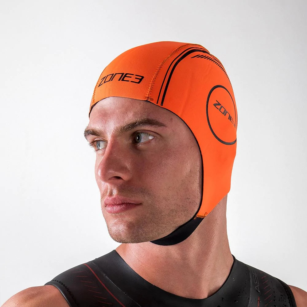 God og varm neoprenhette for svømming fra Zone3 med hele 4mm tykkelse i myk yamamoto-neopren. Den svært synlige oransje fargen gjør også at man blir godt synlig i overflaten.